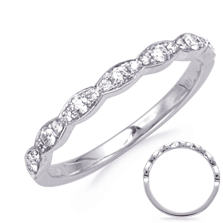 This band is available in 14K White Gold. There are a total of 21 stones. There are Rounds with a total carat weight of 0.23 set in a Micro Prong setting.