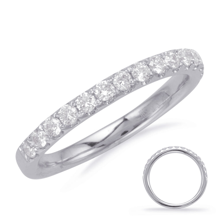 This Band is available in 14K White Gold. There are a total of 11 stones. There are Rounds with a total carat weight of 0.74 set in a Prong Set setting.