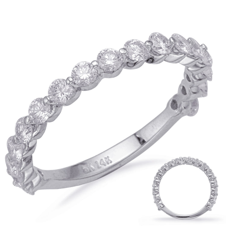 This Band is available in 14K White Gold. There are a total of 17 stones. There are Rounds with a total carat weight of 0.84 set in a Prong Set|Shared Prongs setting.