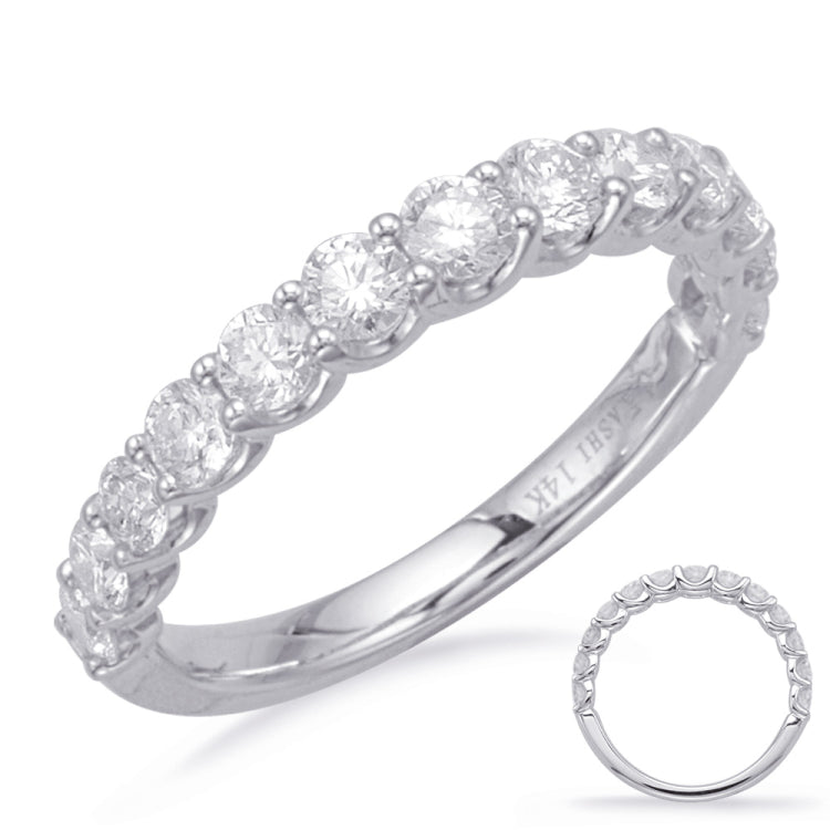 This band is available in 14K White Gold. There are a total of 13 stones. There are Rounds with a total carat weight of 0.99 set in a Prong Set|Shared Prongs setting.