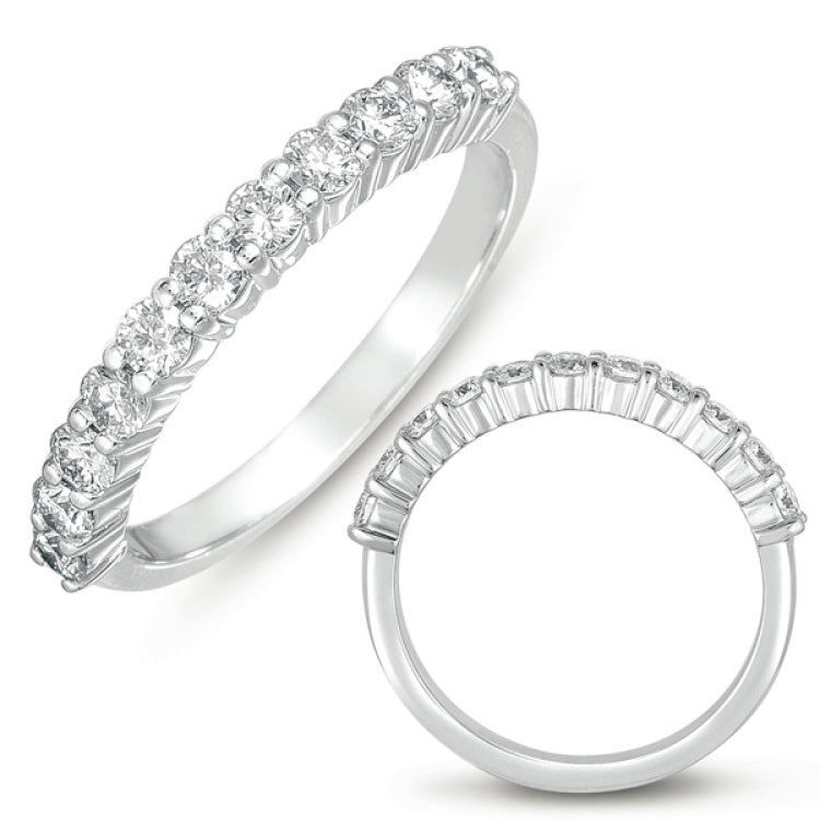 This Band is available in 14K White Gold. There are a total of 11 stones. There are Rounds with a total carat weight of 0.54 set in a Prong Set setting.
