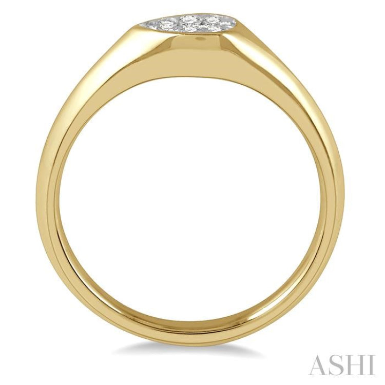 Built into this Lovebright diamond ring, a pear shape cavity forms the focal center. This white gold pear shape cavity centerpiece is embellished with dazzling round cut diamonds. 10 invisible set round cut diamonds can be seen adorning the centerpiece. With the rest of the ring in plain yellow gold, this diamond accented center becomes the center of attraction. The ring is framed in a two tone finish, with the head in 14 karat white gold and shank in 14 karat yellow gold. Total diamond weight is 1/10 Ctw.