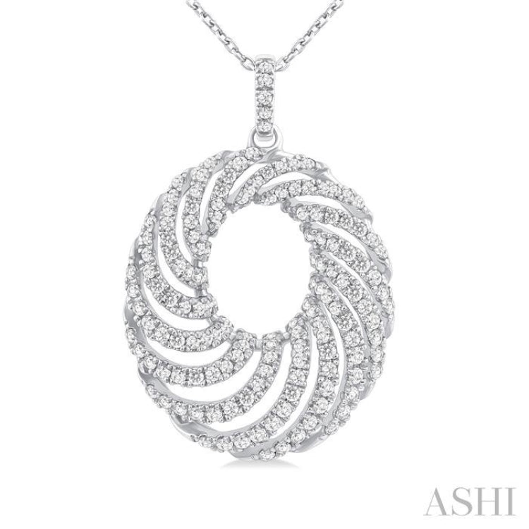 In jewelry, the circle symbolizes wholeness, continuity, and the cyclical nature of life, making this diamond fashion pendant a timeless emblem of unity and everlasting elegance. It showcases an exquisite open-window oval-shaped swirl pattern. The pendant features shorter swirls on the top half and larger, more dramatic swirls on the bottom half, together adorned with a total of 147 prong set round cut diamonds. A loop holder, accented with 5 prong set round cut diamonds, elegantly suspends the pendant from a CAT25 link chain. Both pendant and chain are styled in a rhodium finish 14 karat white gold. The total diamond weight is 1 Ctw.